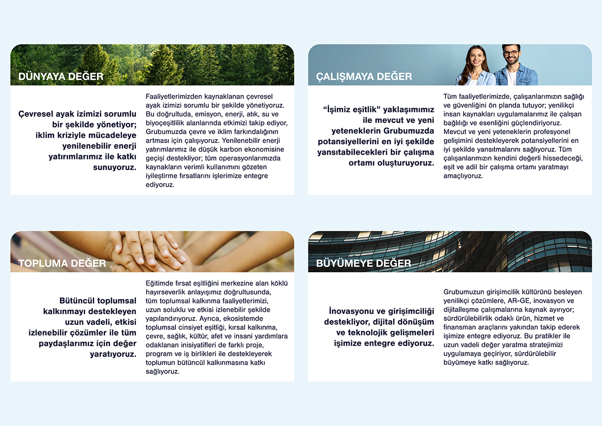 Grubumuzun gelecek nesiller için sürdürülebilir bir dünya yaratma stratejisini, “Dünyaya Değer”, “Topluma Değer”, “Çalışmaya Değer” ve “Büyümeye Değer” temaları etrafında şekillendiriyoruz.